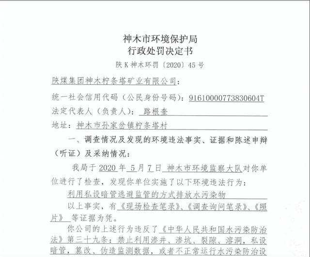 如原神木市环保局做出的“陕K神木环罚(2020)45号”行政处罚决定书显示,2020年5月7日,环境监察执法人员在陕煤神木柠条塔矿业有限公司现场检查发现,该公司利用暗管/旁路等逃避监管方式违法排污,因违反《中华人民共和国水污染防治法》相关条款,后被行政处罚50万元。