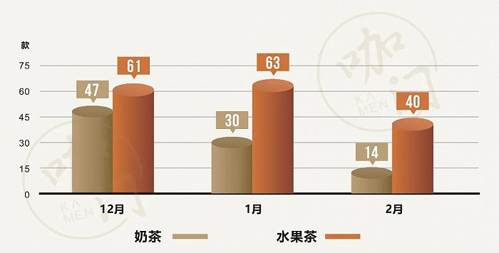 从月份看:12月、1月、2月,水果茶上新均超过奶茶,1月、2月更为明显;