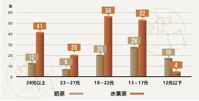 从不同价格带看:除12元以下价格带品牌奶茶新品多于水果茶外,其余价格带均为水果茶上新多。这意味着,在定价合适的成本结构下,品牌更多选择推出水果茶。