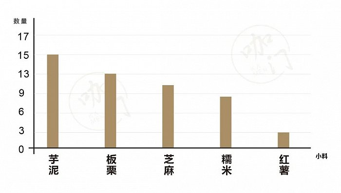 统计奶茶中使用到的小料数量,芋泥使用数量依旧最多,有15款,其次是板栗,共有13款,芝麻共出现了10次。