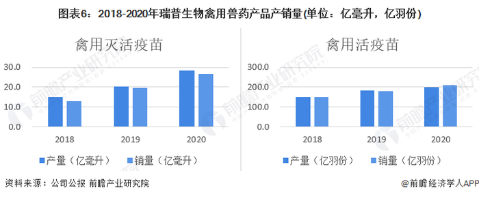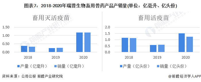 从瑞普生物畜用兽药产品产销量变化来看,产销量基本保持平衡。2020年瑞普生物畜用灭活疫苗产销量分别为1.18亿毫升、1.19亿毫升;畜用活疫苗产销量均为1.5亿头份。