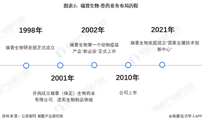 1998年,瑞普生物研发部正式成立,并于2010年上市。2001年起,瑞普生物并购成立瑞普(保定)生物药业有限公司,进军生物制品领域。2002年便推出第一个动物疫苗产品“新必妥”。2021年瑞普生物发起成立“国家生猪技术创新中心”。具体布局历程如下: