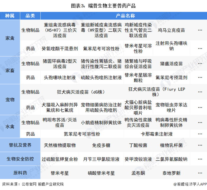 瑞普生物目前拥有家禽、家畜、宠物、水禽等动物用兽药产品280多种,其中化学药物近170种,生物制品60多种,饲料添加剂30多种,植物提取制剂30多种,已成为国内兽药行业产品种类规格最全、生产规模最大的企业,并是国内在生物制品、原料药和制剂领域均具有较强竞争优势头部企业之一。该公司主要兽药品种如下: