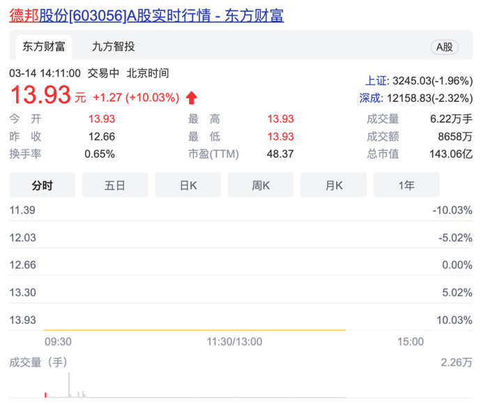 今日,德邦股份开盘一字涨停。截至14:11报13.93元,涨幅10.03%。据经济观察报报道,通常情况下,利好性质的收购交易,会刺激股价上涨,但是停牌之前突然上涨,投资者会质疑是否资金提前获知收购相关的内幕消息。