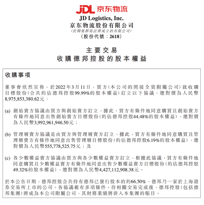 3月11日晚,德邦发布公告表示,京东物流将收购德邦物流股份有限公司66.49%的股份。交易完成后,董事长兼总经理崔维星将不再是公司的实际控制人。京东物流俨然成了德邦的新东家。