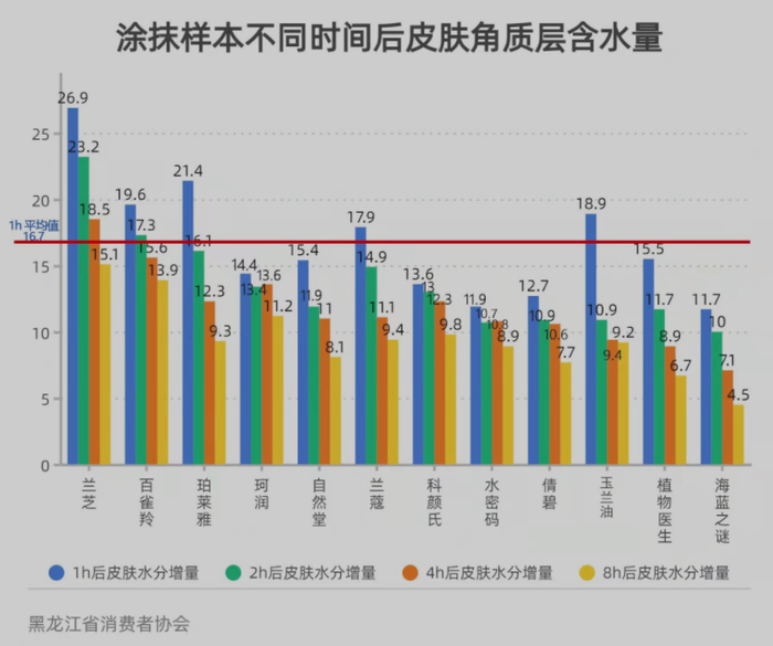 在涂抹样品1小时后的测试中,保湿功效好的样品提升皮肤角质层含水量为26.9,最低的样品为11.7,平均值为16.7。只有5款样品高于12款样品提升皮肤角质层含水量的平均值。