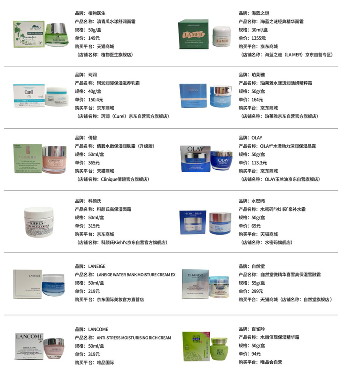 本次比较试验的样品由工作人员以普通消费者的身份分别在天猫商城、京 东商城、唯 品 会3个电商平台,共购买12款包括海蓝之谜、倩碧、科颜氏、自然堂、珂润、珀莱雅、植物医生、百雀羚、水密码等知名品牌的产品,单价从69元到1355元不等。