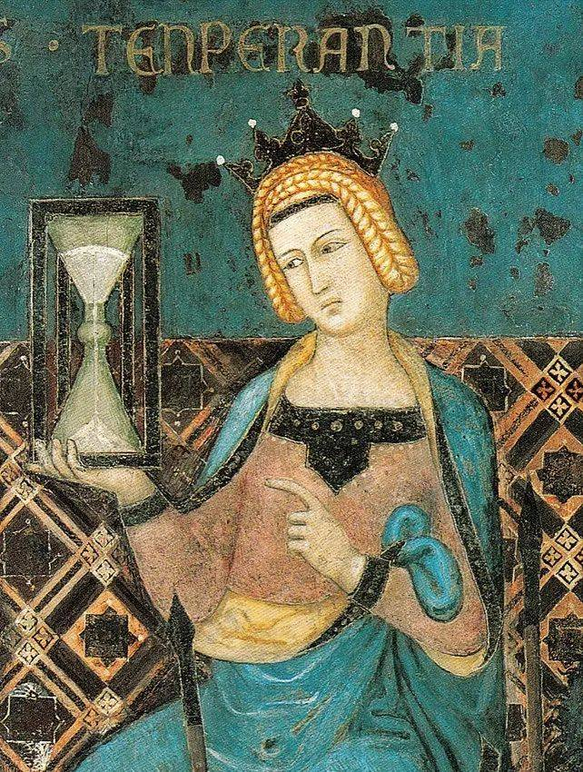 约1338年,安布罗乔·洛伦泽蒂(Ambrogio Lorenzetti)在锡耶纳的帕布利科宫创作的壁画《善政府与恶政府的寓言》(the Allegory of Good and Bad Government),描绘了寓言节欲的细节。© wiki