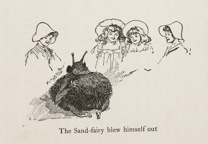 内斯比特(E. Nesbit)1902年创作的《五个孩子和它》(Five Children and It)中易怒的赛米德(Psammead),也叫沙仙子,是被一群孩子在沙坑里发现的。它可以通过将自己变大来实现愿望,然后再变回原样。书中解释说,沙仙子现在已经不多见了,因为它们曾经生活在海边孩子们建造的沙堡里,但由于沙堡总是流入海水,他们几乎全部都死掉了。