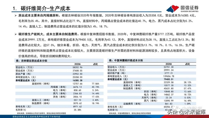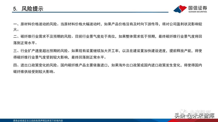 扩产计划:国内的吉林化纤集团、中复神鹰、光威复材等公司均有碳纤维及碳丝的扩产计划(详见下表),吉林化纤:2021年1月宣布在 “十四五”期间将完成20万吨原丝、6万吨碳纤维及1万吨复合材料。中复神鹰:预计2021年底,建成投产1万吨碳纤维及配套原丝项目。新疆隆炬:2021年3月宣布建设年产5万吨碳纤维碳化项目。国泰大成:2021年3月宣布建设年产1万吨碳纤维、2.5万吨原丝项目。(报告来源:未来智库)