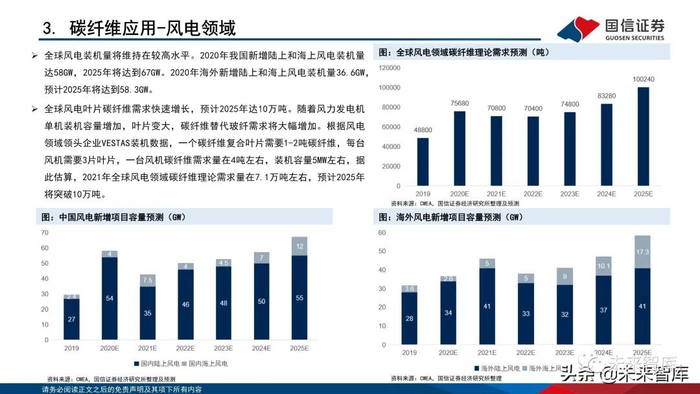 风机大型化趋势,叠加Vesta专利到期影响,将拉动大丝束碳纤维需求增长。大丝束碳纤维性能优越,可以使得叶片减重30%,因此超过3MW的风 机和超过50米的风电叶片需要运用到大丝束碳纤维。同时Vestas将碳纤维风电叶片制作低成本化,随着专利即将到期,国内风电厂将积极开发此 类风电叶片,大丝束碳纤维需求将快速增长。(报告来源:未来智库)