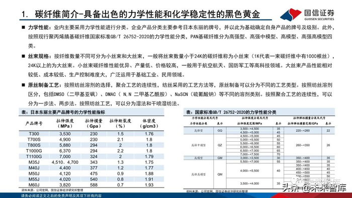 力学性能:业内主要采用力学性能进行分类。企业产品分类主要参考日本东丽的牌号,并以此为基础确定自身产品的牌号及级别。此外, 按照现行聚丙烯腈基碳纤维国家标准GB/T 26752-2020的力学性能分类,PAN基碳纤维分为高强型、高强中模型、高模型、高强高模型四 类。