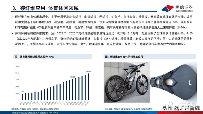 碳纤维在体育休闲市场中,主要使用于高尔夫球杆、曲棍球棍、网球拍、钓鱼竿、自行车架、滑雪板、赛艇等高端体育休闲市场。该块 应用主要基于碳纤维的轻质、高强度、高模量、耐腐蚀等特点。例如碳纤维复合材料制作的高尔夫球杆比金属杆减重近 50%,碳纤维自 行车较铝材减重 40%且实现更高的车架精度。钓鱼竿、球拍、滑雪板、高尔夫球杆等体育用品的碳纤维多使用大丝束碳纤维(≥24K)。