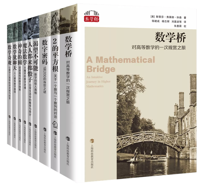 由中国科学院院士严加安题写品牌标语的“数学桥丛书”是一个面向大众的数学科普系列,讲述数学给人类带来的重大影响,揭示日常生活中的数学奥秘,激发读者的科学创新精神。上海科技教育出版社总编辑王世平解释,“数学桥”本是剑桥王后学院的一座木桥,传说这座桥最初是由牛顿设计的,在建造时没有用一根钉子或螺栓,所以又名牛顿桥,“希望这个美丽的误会为品牌增添几分色彩。”
