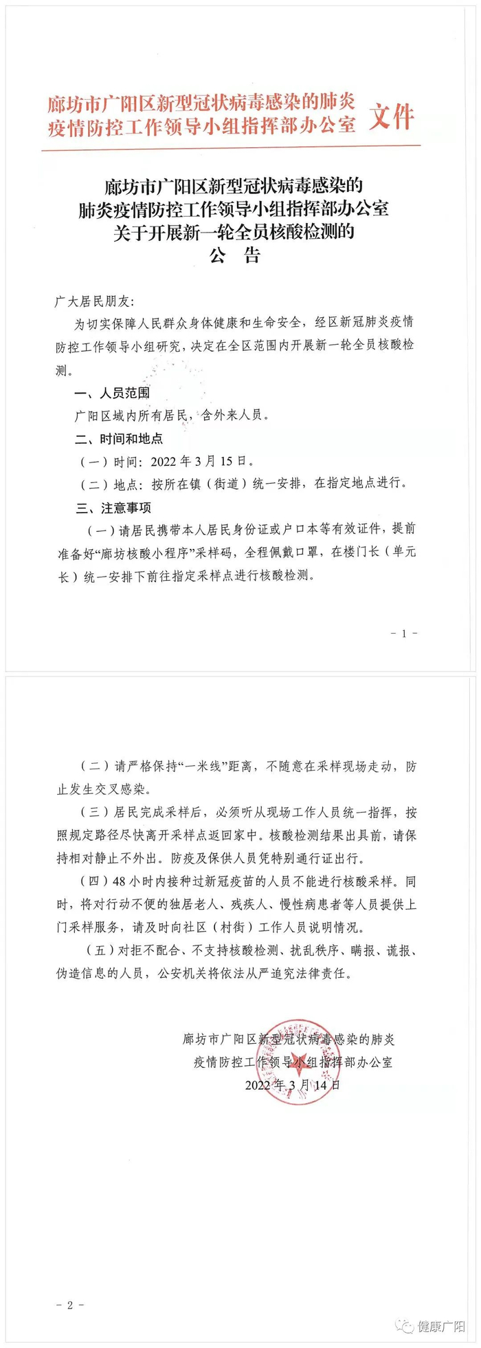 廊坊市安次区新冠肺炎疫情防控工作领导小组办公室关于连续五日开展全域全员核酸检测的公告