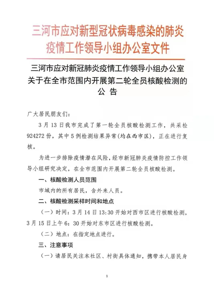 关于对任丘市全域进行第二轮全员核酸检测的通告