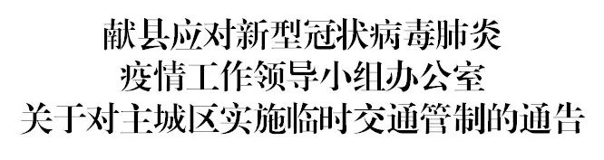 根据当前疫情防控需要,为进一步降低因人口流动带来的疫情传播风险,依据《中华人民共和国道路交通安全法》《中华人民共和国传染病防治法》《中华人民共和国突发事件应对法》的相关规定,经县应对新型冠状病毒肺炎疫情工作领导小组研究,决定自2022年3月14日起,对进出主城区的车辆、人员实施临时交通管制,在主要路口设置疫情防控检测点。现通告如下: