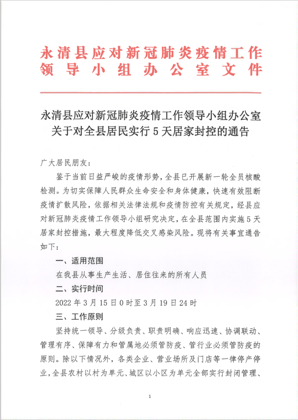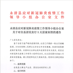 文安县应对新冠肺炎疫情工作领导小组办公室关于对全县居民实行5天居家封控的通告