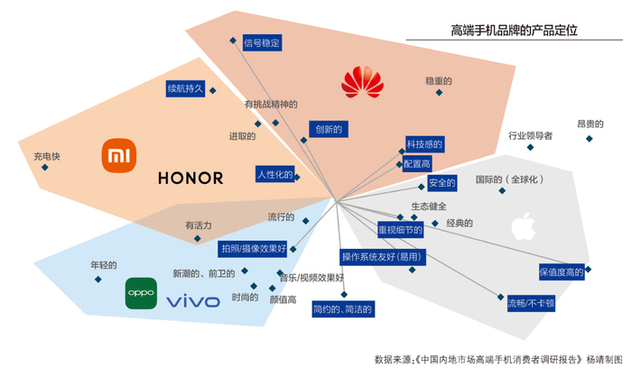 从消费者对高端手机情感因素来看,华为给消费者突出的高端形象是创新和科技感,苹果则是保值度高、重视细节及安全,消费者区分较为明显且具有差异。但是从消费者对高端手机的功能因素来看,消费者明显倾向于苹果更符合操作系统友好(易用)、流畅不卡顿这两个重要的高端品牌形象,华为则更加符合信号稳定、配置高的高端品牌形象。而荣耀、小米、OPPO、vivo等在用户心目中虽然也留下了新潮、前卫、进取、颜值高的印象,但并不符合用户对于高端手机的产品定位。