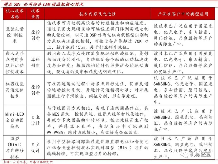 LED固晶机及配套封装设备为公司核心业务。在LED领域,公司的客户包括国星光电、东山精密、兆驰股份、三安光电、华天科技、鸿利智汇、瑞丰光电、雷曼光电、厦门信达、晶台股份等知名公司,并与国际知名厂商SAMSUNG、亿光电子等保持良好合作。公司在LED固晶机领域具有技术优势,是LED固晶机领域的领先者。