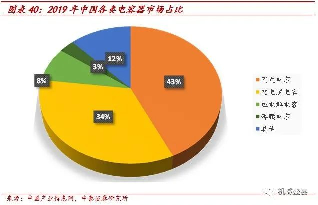 电容器是电子设备中被广泛应用的基础电子元件之一,根据介质不同,可分为铝电解电容器、钽电解电容器、陶瓷电容器和薄膜电容器等。近年来,随着信息技术和电子设备的快速发展及全球制造业向国内转移,电容器需求呈现出整体上升态势,我国已成为世界电容器生产大国和出口大国。根据中国电子元件工业协会数据,2019年中国电容器市场规模为1102亿元;根据中国产业信息网数据,2019年陶瓷电容器在国内电容器市场总量中占比最高并达到43%,其次是铝电解电容器,市场份额占比达到34%。