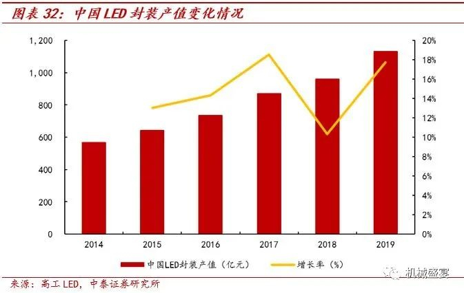 我国是LED封装大国,Mini&Micro-LED的发展也带来对封装设备的增量需求。我国LED封装产业发展之初,主要的封装生产设备大多依赖国外进口,而如今国内的LED生产设备制造业已有了长足的发展,如全自动固晶机、全自动焊线机、全自动封胶机等LED封装设备均实现国产,且产品在市场上有较强的竞争力。高精度、全自动化的LED设备,使生产出的LED具有较好的一致性和批次稳定性,有利于封装厂商对生产产品品质的控制。随着人力成本的不断攀升,封装厂家对高自动化的LED封装设备需求也越来越大。根据高工LED数据,2014-2019年中国LED封装产值由568亿元增长至1130亿元,CAGR为14.75%,中国封装行业稳步增长。LED封装产值的稳步上升促进了封装设备的投资,随着Mini&Micro-LED的发展,对封装设备的需求也会加大,固晶机作为主要封装设备有望率先受益。