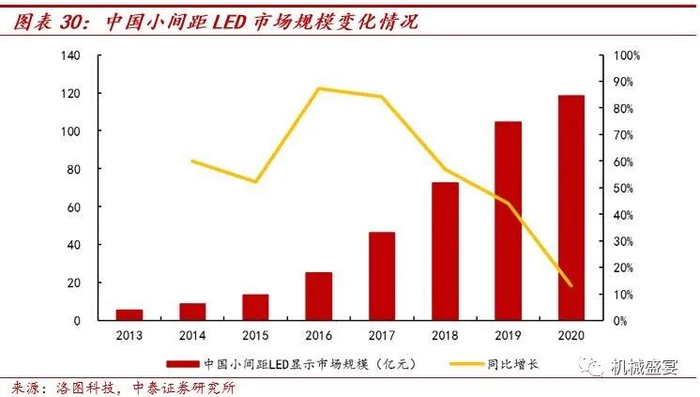 现阶段公司固晶机应用于小间距LED显示屏较多,小间距LED市场规模稳步增长。LED小间距显示屏一般指分辨率在P2.5以下(含)的LED显示屏,广泛应用于广告传媒、文化演艺、体育场馆、高端会议室、交通控制、高端车展、安防、夜景经济等领域,其中户外广告、舞台租赁等市场已较为成熟。随着SMD LED技术的成熟,小间距LED显示屏逐步呈现出替代DLP和LCD等传统显示屏的趋势。根据洛图科技数据,2013-2020年中国小间距LED市场规模由5.5亿元增长至118.2亿元,CAGR约55%。