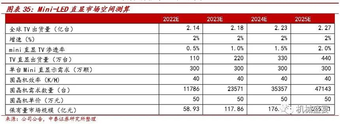 Mini-LED背光固晶机需求测算:根据测算,2025年,TV、平板、笔电Mini LED背光领域固晶机的市场规模为57亿元。(假设条件:①2022-2025年,全球TV、平板、笔电出货量以2%的增速稳定增长;②2022-2025年,全球TV、平板、笔电Mini LED背光渗透率分别为5%、10%、20%、30%;③单台TV、平板、笔电Mini LED背光需求分别为20000颗、10000颗、15000颗;④mini背光固晶机效率为每小时4万颗灯珠、单台固晶机每天工作20小时,每年运转350天;⑤假设mini背光固晶机价格为50万元/台)。