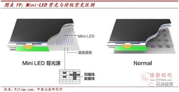Mini-LED背光是指使用Mini-LED芯片作为LCD屏幕光源。与Mini-LED RGB显示不同,Mini-LED背光是将LCD原有的光源替换成直下式且更小的Mini-LED白光芯片,其好处在于更密集的直下式光源可以为LCD显示提供更细腻的显示效果,且可以做到分区控制光源,使显示效果更佳。