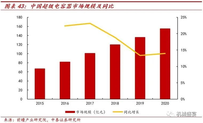 超级电容应用广泛,有望快速增长。超级电容器又称双电层电容器、电化学电容器,是一种新型储能装置,其具有充电时间短、使用寿命长、温度特性好、节约能源和绿色环保等特点。超级电容器作为高效储能器件,广泛应用于国防军工、轨道交通、城市公交、发电与智能电网、消费电子等重要领域。超级电容的推广有效解决了大负荷电路运行的难题,保证了电力电子设备使用性能的正常发挥。超级电容凭借在性能方面的优势,应用范围正逐渐扩大。目前国内超级电容器市场渗透率较低,发展潜力大。前瞻产业研究院数据显示,2015-2020年我国超级电容器市场规模由67亿元增长至155亿元,CAGR为18.26%,增长势头良好。
