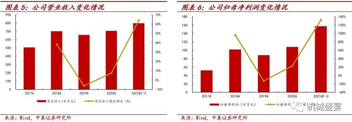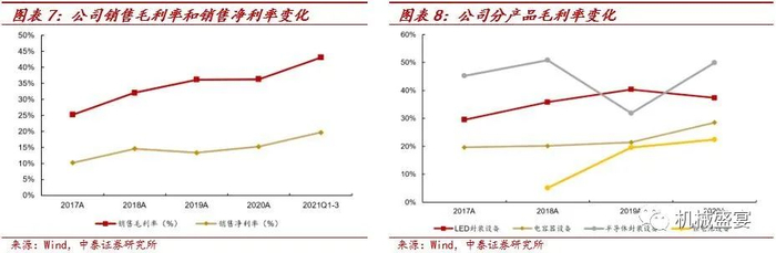 ③公司业绩加速增长,盈利能力逐步提升。2017-2020年,公司营业收入由5.05亿元增长至7.04亿元,CAGR为11.7%;归母净利润由0.52亿元增长至1.08亿元,CAGR为27.8%。2021年,LED和半导体市场需求持续向好,公司业绩加速增长。根据业绩快报,2021年公司实现营业收入11.97亿元,同比增长69.90%;实现归母净利润2.31亿元,同比增长115.07%。受零部件自制率提高、毛利率较高的Mini-LED固晶机和半导体固晶机营收快速增长等推动,公司盈利能力逐步提升,2017-2020年前三季度,公司销售毛利率由25.23%增长至43.07%。
