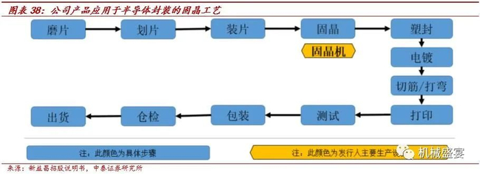 半导体领域聚焦封装环节。半导体封装是指将通过测试的晶圆按照产品型号及功能需求加工得到独立芯片的过程。封装主要起到保护芯片、支撑芯片、将芯片电极与外界电路连通及保证芯片的可靠性等作用。半导体封装测试工艺流程中的固晶是公司半导体设备应用的主要环节。此类封装设备过去依赖进口,国内厂商大多采用国外厂商ASMPT的设备,新益昌正逐步进行国产替代,其客户主要包括晶导微、灿瑞科技、扬杰科技、通富微、固锝电子等知名公司。