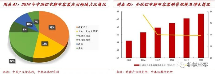 铝电解电容器是由铝圆筒作负极以及一片弯曲的铝带作正极,同时里面注有液体电解质而制成。铝电解电容器因其具有体积小、储存电量大、性价比高等显著优点,已广泛应用于消费类电子产品、电脑及周边产品、汽车工业及电子通信等领域。从我国2019年铝电解电容器的应用领域分布来看:消费类电子产品占35%左右,是铝电解电容器的最大市场;其次是电脑及周边产品占22%左右;工业、电力和照明领域占18%的比例。