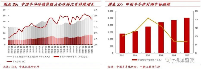 中国是全球最大的半导体市场。中国半导体销售额占全球的比重持续增长,根据美国半导体行业协会(SIA)数据,2015年3月-2021年12月,中国半导体销售额占全球的比重由27.42%增长至33.75%。2021年全球半导体市场销售额为5559亿美元,同比增长26.2%;中国半导体市场销售额为1925亿美元,同比增长27.1%,占全球的比例为34.6%,是全球最大的半导体市场。依托市场优势,中国半导体设备、封测等厂商长期成长可期。