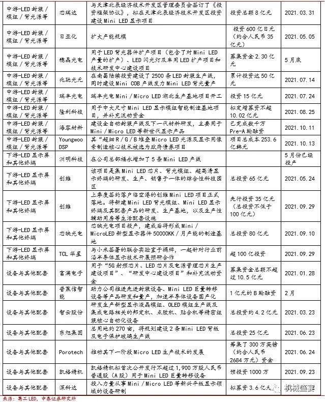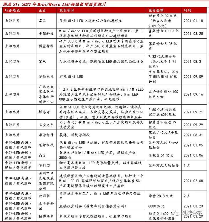 芯片厂及封装厂商纷纷抢先布局,2021年Mini/Micro LED等领域新增投资超过750亿元。近年来,各大厂商纷纷在Mini LED和Micro LED方面布局,三安光电、华灿光电、瑞丰光电、国星光电、澳洋顺昌、晶元光电股份有限公司等LED芯片、封装巨头,以及利亚德、兆驰股份、洲明科技、华星光电和京东方等显示器和面板厂纷纷布局Mini/Micro LED。根据高工LED不完全统计,2021年Mini/Micro LED等领域新增投资超过750亿元。