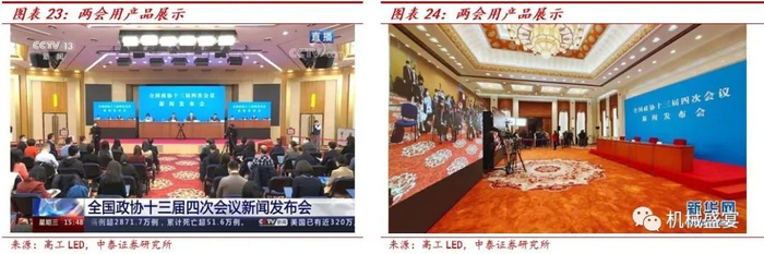全国两会使用Mini-LED RGB直显超高清显示屏,其商用大潮有望到来。根据LED显示应用头部企业利亚德介绍,2021年三月,全国两会在北京举行,其为全国两会提供了P1.2(像素点间距1.2mm)的小间距高清显示屏和P0.9的Mini-LED显示屏,7块屏幕共计百余平方米。Mini-LED RGB直显技术应用于两会标志着规模化商用的大潮将要到来。