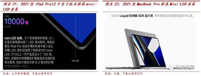 苹果Mini-LED产品有望引领行业风潮。2021年4月,苹果推出的12.9英寸的iPad Pro使用了Mini-LED背光多点触控显示屏,采用超过10000颗LED,2596个全阵列局部调光区,全屏亮度最高可达1000尼特,峰值亮度可达1600尼特,对比度达到1000000:1,实现了极为专业的显示效果,上市之初售价为1099美元,与上一代产品价差仅100美元,屏幕换代性价比突出。2021年10月,苹果发布搭载Mini-LED屏幕的MacBook Pro(14英寸和16英寸),实现了高对比度和高亮度的显示效果。苹果作为电子行业的风向标,其Mini-LED新产品的持续推出有望引领行业风潮。