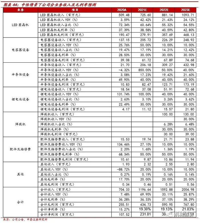 LED固晶机:公司在固晶机领域竞争实力强,受益于Mini LED的快速发展,公司LED固晶机业务将快速增长。同时Mini LED固晶机盈利能力强于传统固晶机,随着Mini LED固晶机的快速增长,公司LED固晶机业务的毛利率将稳步提升。假设2021-2023年,公司LED固晶机营收增速分别为42.42%、21.43%、24.12%;毛利率分别为38.58%、40.59%、42.80%。