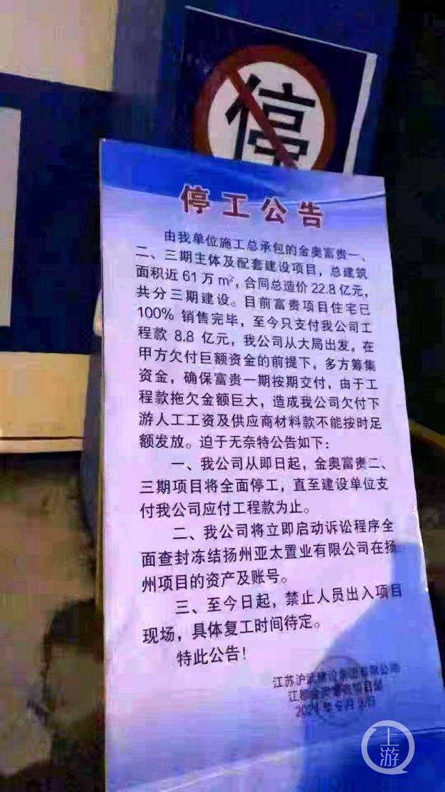 ▲2021年9月9日,扬州金奥富贵项目因开发商拖欠施工方14亿工程款停工。图片来源/受访者供图