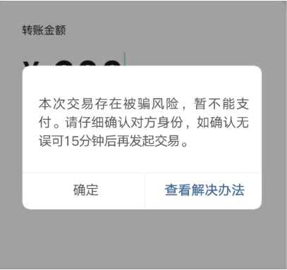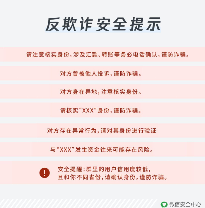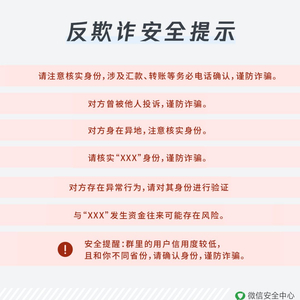 用户若收到微信客户端的反欺诈安全提示、交易风险提示或交易拦截,应该仔细查看安全提示,提高防范意识,并及时核对对方身份,再进行后续操作,主动降低欺诈风险以保护自己的资金安全。