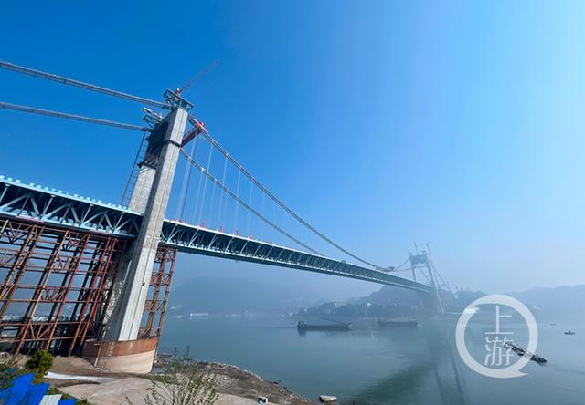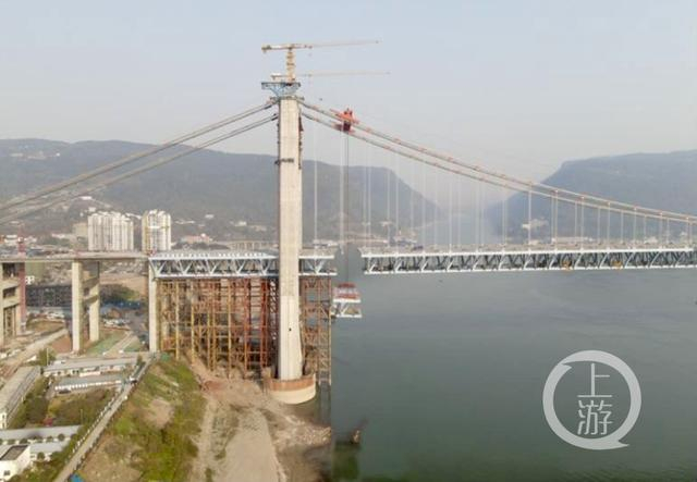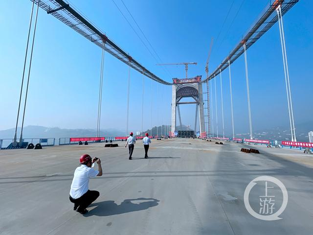 “大桥主桥钢桁梁采用67.5米+720米+75米三跨连续体系,主跨跨径720米,这是目前国内跨度最大的公轨两用悬索桥。”郭家沱长江大桥项目经理吴宝初介绍,郭家沱长江大桥采用单孔悬吊双塔三跨连续钢桁梁悬索桥设计,上层桥面宽41米,双向八车道,为城市快速路过江通道,设计时速80公里/小时;下层桥面宽17米,为轨道8号线预留过江通道。