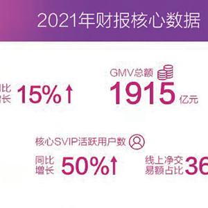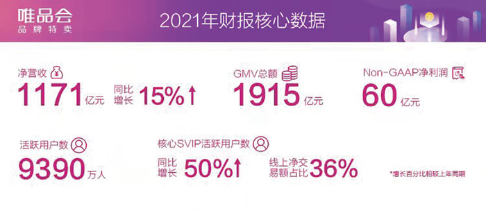2月23日晚,中国领先的在线品牌折扣零售商唯品会发布2021年财报数据。2021年,唯品会整体业务实现稳健增长,全年活跃用户数较2020年同比增长12%,达9390万人;GMV同比增长16%,达1915亿元(人民币,下同);总订单量同比增长14%,达7.9亿元。受益于用户和ARPU的稳步增长,全年收入同比增长15%,达1171亿元;Non-GAAP净利润超过60亿元。