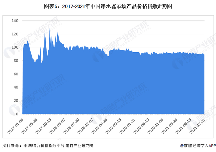 以近5年来中国净水器行业产品价格走势来看,净水器市场产品价格指数在2018年达到近五年内的峰值,整年内产品价格指数基本在100左右浮动,此后便呈现出波动下降趋势。截至2021年12月31日,中国净水器市场产品价格指数89.13,价格指数小幅下降。