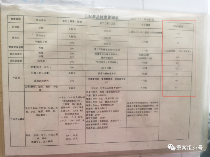▲7-11通州新华联家园店内张贴的《日配商品鲜度管理表》显示,除米饭外所有日配食品加热后“鲜度”均为4小时,但事实上店铺往往一天一废弃。新京报调查暗访组 摄