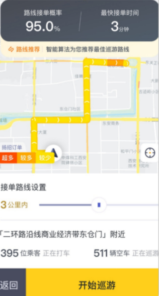 西安出租汽车司机李师傅拿起手机,向笔者详细介绍了热力图功能。在嘀嗒出租车司机端App的热力图功能中,系统正通过黄色、橘色和红色展示着方圆几公里内,不同区域的乘客打车需求,颜色越深则代表该区域出租汽车需求量越大。“有时候我所在的地方用车需求不高,我就会打开热力图,看哪些地方用车需求高,包括我开到的那个地方大概需要多长时间,到那以后预计能接到几单,都能在这里面看到。”李师傅说。