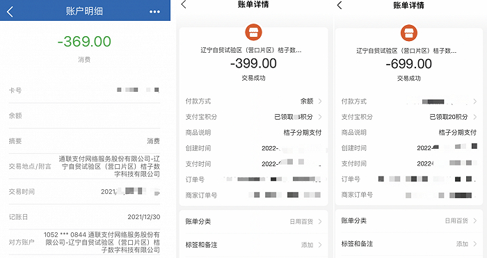从账单明细来看,收款方为辽宁自贸试验区(营口片区)桔子数字科技有限公司(下称 “桔子数科”),部分账单分类显示为日用百货。桔子数科由大连桔多多科技有限公司(下称 “桔多多科技”)控股,营口国资旗下营口股权(创业)投资引导基金管理有限公司和营口创业投资引导基金有限公司参股。