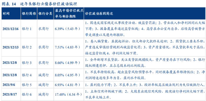 银行业信用风险事件:历史出现过风险事件的商业银行,除股份行恒丰银行以及包商银行、甘肃银行、盛京银行、丹东银行等城商行外,大多为资产质量恶化、不良率攀升、盈利下滑等弱资质农商行。2021年以来,银行业风险事件频发,债券估值收益率波动明显加大。