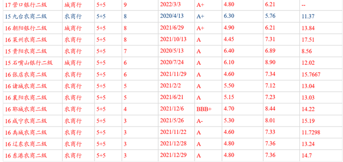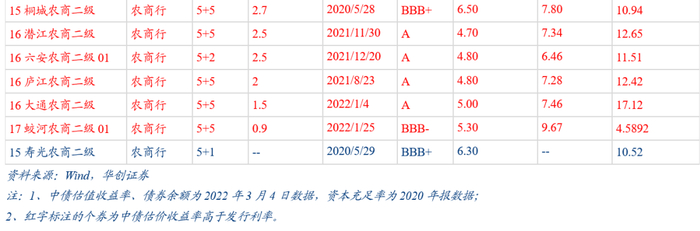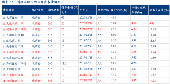 中小银行展期风险逐渐显现。按照监管规定,行使赎回选择权需满足赎回后的资本充足水平仍明显高于监管要求,2021年起,中小银行展期事件明显增多。值得关注的是,2013-2016年发行的二级资本债中,除“14建行二级01”尚未到期(10+5)之外,其他债券到期均未赎回,涉及主体均为中小银行。而彼时城农商行的二级资本债发行利率多在5-6%左右,远高于当前水平,因此不赎回的成本较高。这一现象或反映出近年来中小行的资本充足考核压力较大,可能存在滚续发行困难,展期风险在逐步释放。
