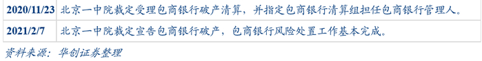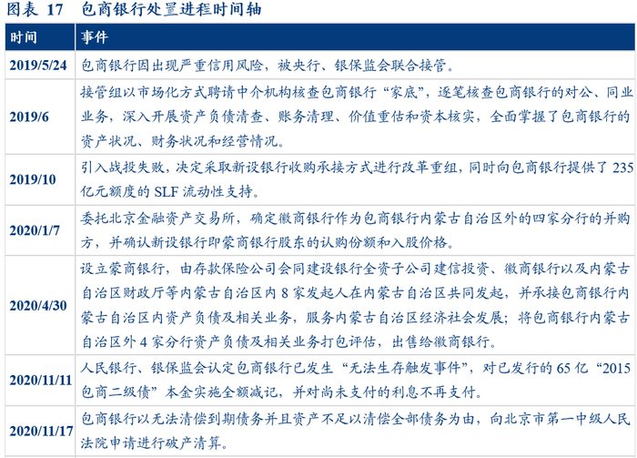 包商银行为内蒙古规模较大的城商行,前身为包头市商业银行,实际控制股东为“明天系”(持股比例为89.27%)。包商银行主营农牧金融业务、小微企业金融服务、金融市场业务等,在市场上具有一定的知名度。自2019年5月24日被央行、银保监会联合接管后,包商银行历经不到2年完成全部资产负债与相关业务处置,2021年2月7日法院裁定宣告其破产,包商银行风险处置工作基本完成。