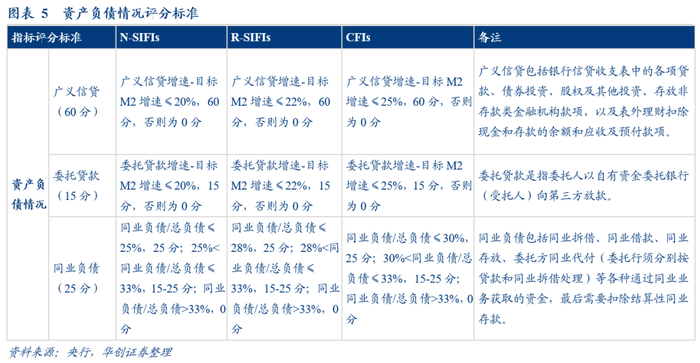 资产负债情况有三项有效评估指标,其中广义信贷占60分,委托贷款占15分,同业负债占25分。广义信贷涵盖商业银行表内的大多数资产,增速基本接近于资产规模增速,对资本充足率有一定制约,广义信贷增速-目标M2增速符合标准要求为60分,否则为0分;委托贷款指委托人以自有资金委托银行(受托人)向第三方放款,委托贷款增速-目标M2增速符合标准则为15分,否则为0分;同业负债包括同业拆借、同业借款、同业存放、委托方同业代付等各种通过同业业务获取的资金,同业负债/总负债指标越低,该项评分越高。